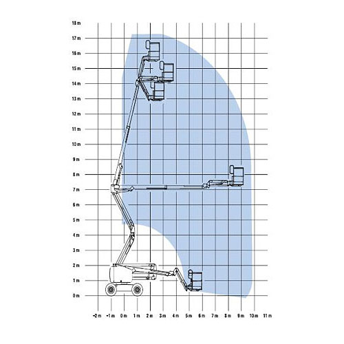 Självgående diesel bomlift med 4-hjulsdrift, teleskop, vikarm och jibb. Upp och över räckvidd 7,16 m. Ingen tailswing.
