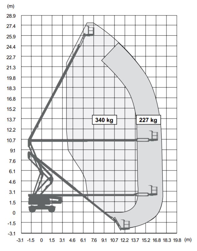Bomlift med 28 m arbetshöjd och bra räckvidd, vikarm, teleskop och jibb. Korglast 340 kg.