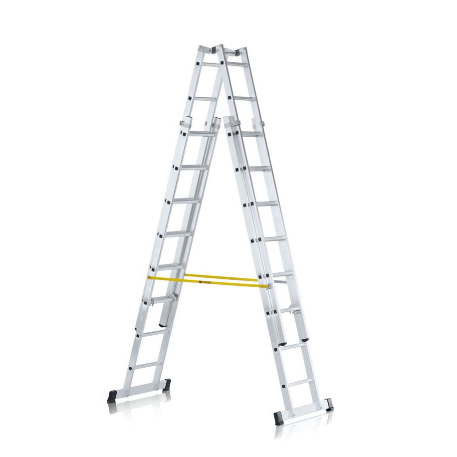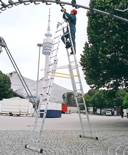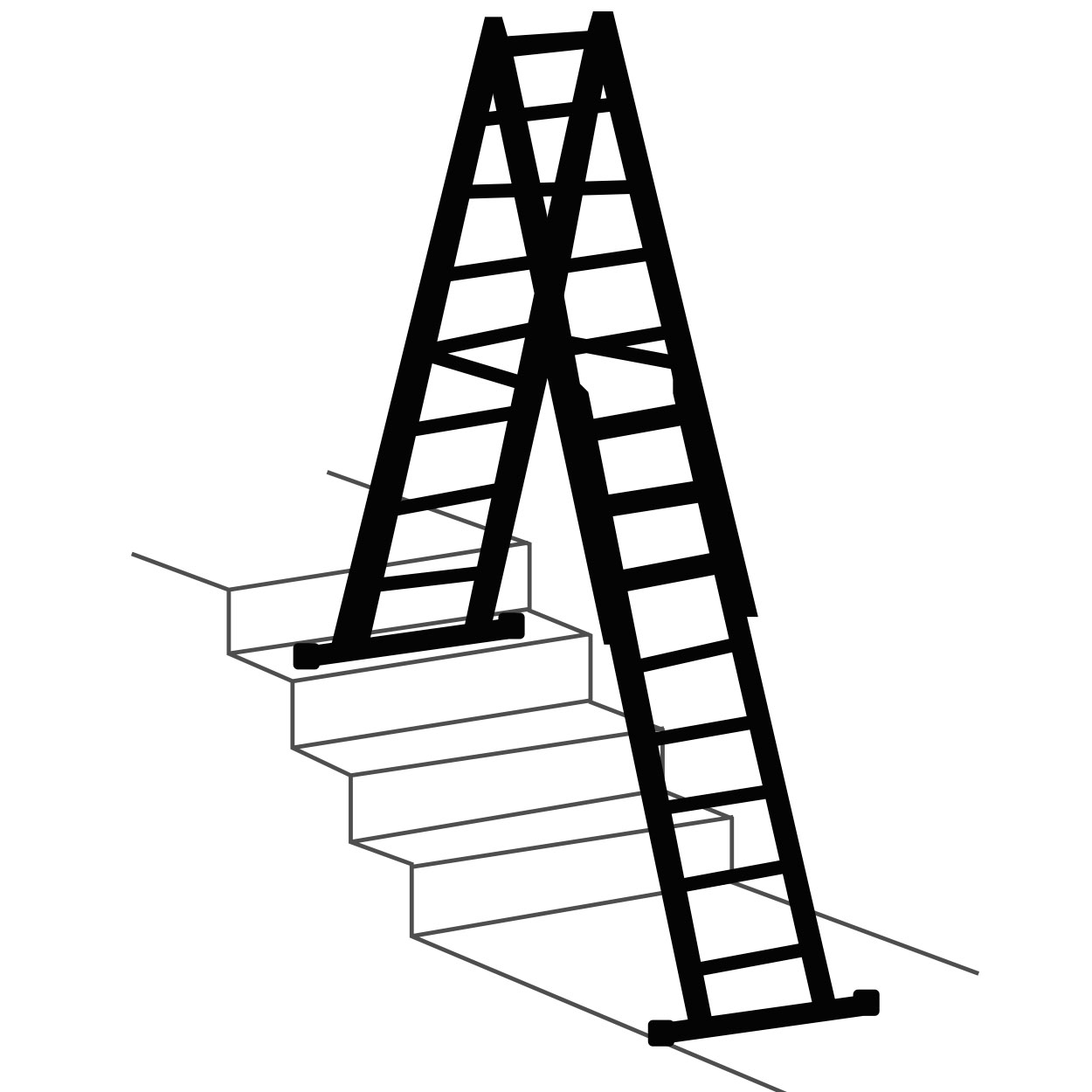 - Stegen kan användas i raka trappor. Ena sidan förlängs då mer än den andra så att stegen står jämnt. Utdragsfunktion för säker arbetsställning på hög höjd.