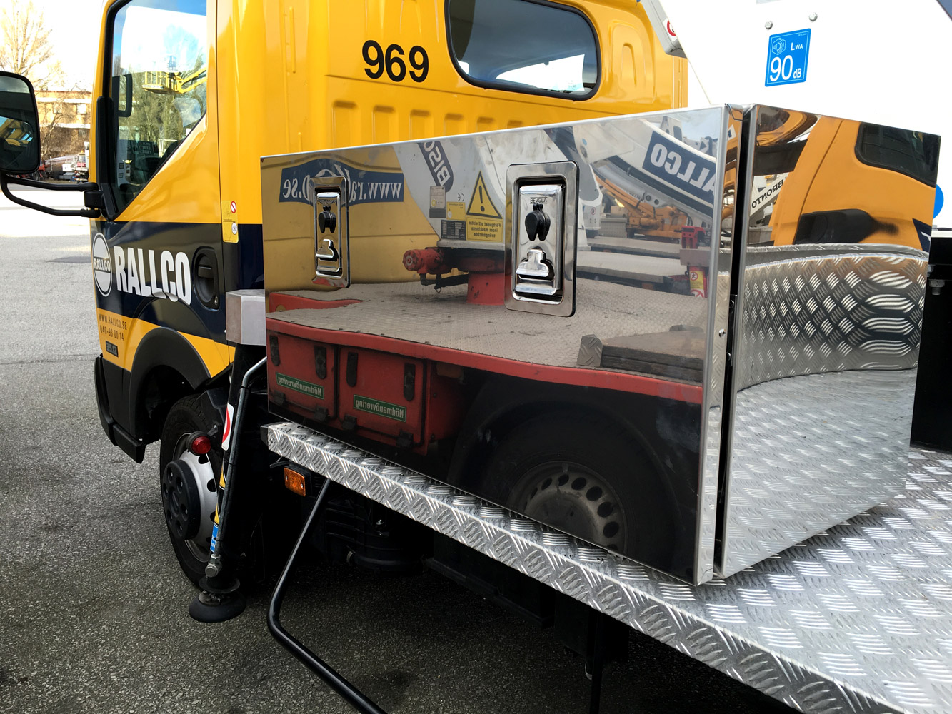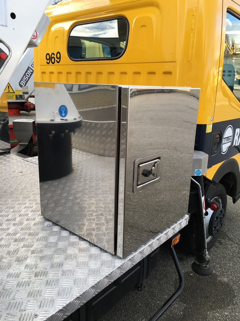 2 Skåp, 500 x 600 x 500 respektive 1000 x 500 x 500, samt öppen låda 2200 x 1200 x 300 finns på flaket.