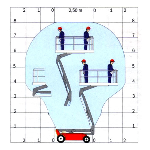 Nytänkande! Smal pelarsaxlift med stor korg (2.50 x 0.99 m) där korgen är svängbar i planet +/- 90 grader.